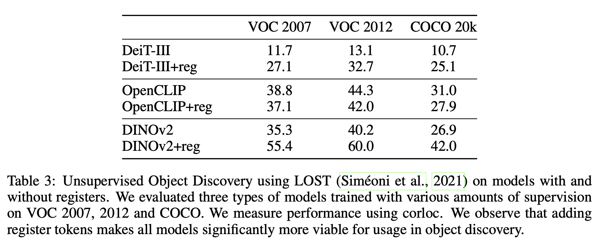 - 특히나 이러한 outlier가 심하게 발생하는 큰 모델인 DINOv2에서 꽤 큰 improvement가 일어난다.