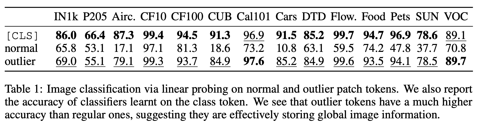 아래에서는, 이러한 outlier-patch 혹은 artifact들이 실제로 global-information을 견인하는가? 에 대한 가설을 위해 여러 evidence를 보여준다.