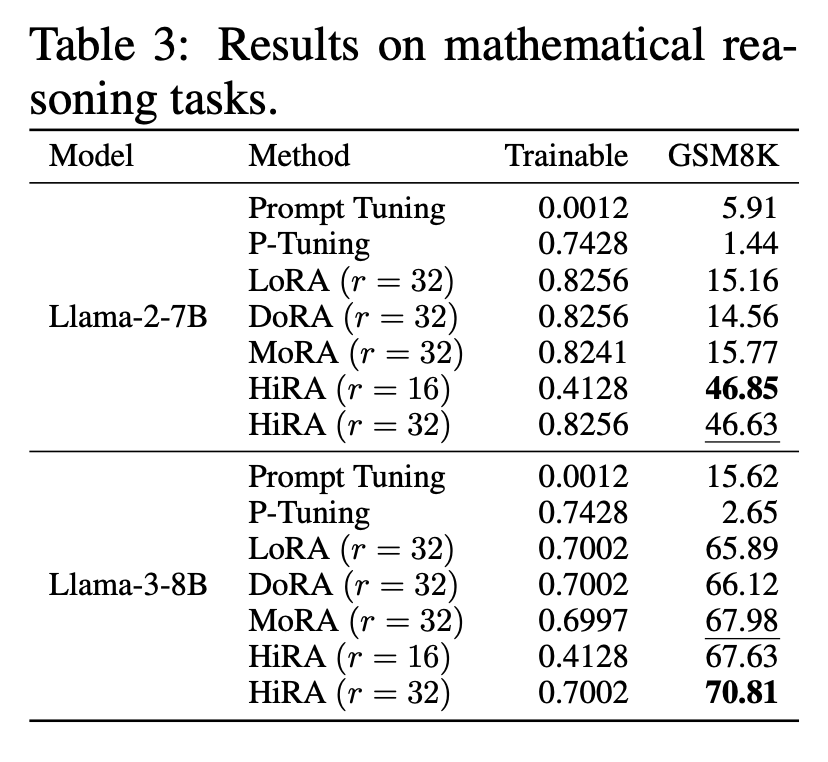 (5) Interestingly, hybrid approach (LoRA + HiRA) works