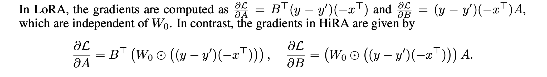 Author also claimed that training HiRA surpass LoRA since it leverges the information encoded in the original weight $W_0$. This encoding might be explained by considering the gradient of lower rank matrices contains the $W_0$, unlike LoRA: