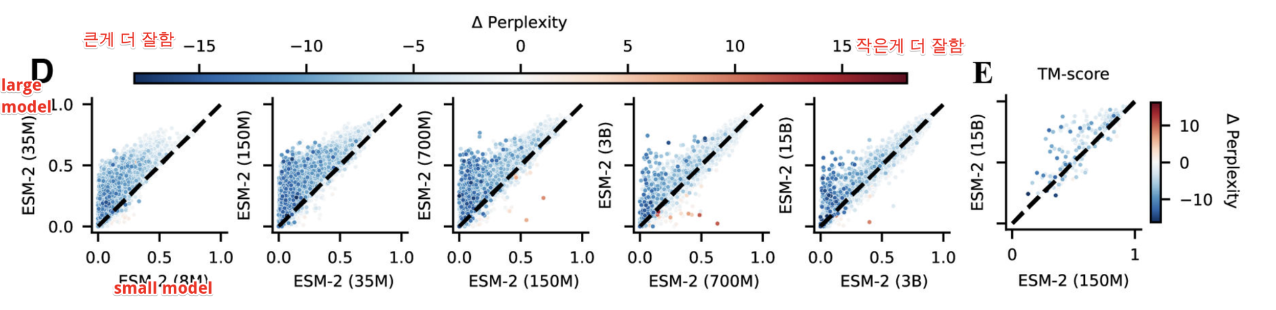 - ESM-2—최대 15B의 파라미터—는 single protein sequence만으로 atomic-resolution structure prediction이 가능하며, language model의 크기가 증가할 수록 더 outperform하게 됨을 관측했다 (Scalability).