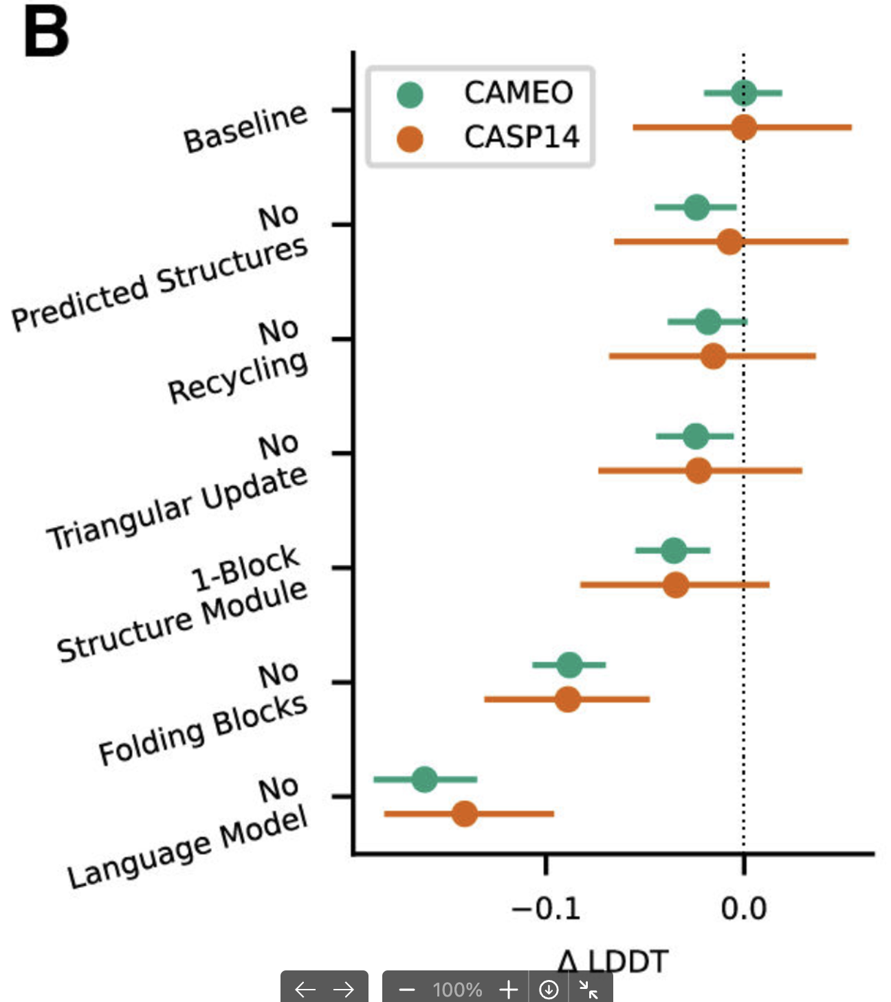 (+) 또한, Ablation study에서는 folding trunk (AF2의 Evoformer)와 Language model의 규모를 축소시키며 성능을 측정하는데, language model의 사이즈를 줄이는 것이 가장 영향이 큰 것을 보였다. → Language model이 가장 큰 contrubtion을 하고 있는 것으로 예상.