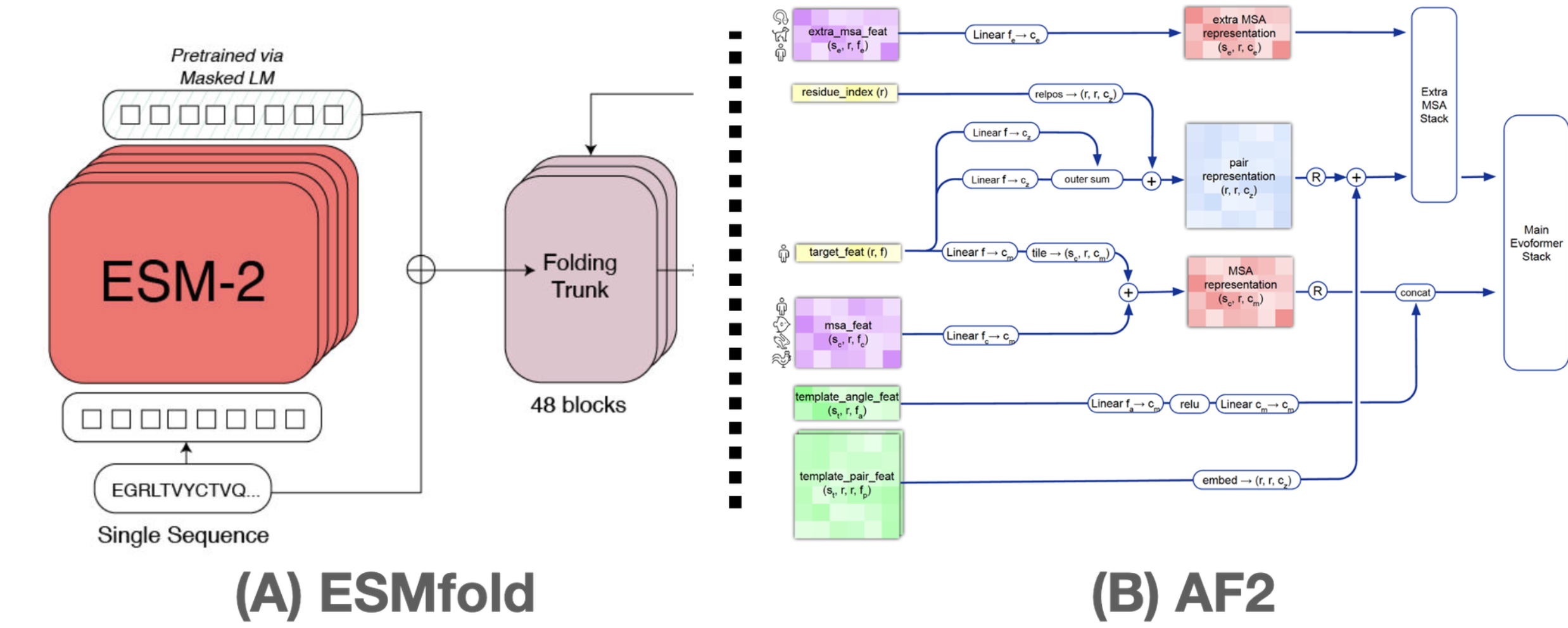 Transformer based 연산을 시작하기 전의 “embedding (representation, feature-engineering)” 과정 비교. ESM-2는 pretrained language model을 사용하고, AF2는 template, MSA등에 대해 differentiable한 연산을 복잡하게 부여함으로 end-to-end modeling을 할 수 있도록 만들었다.
