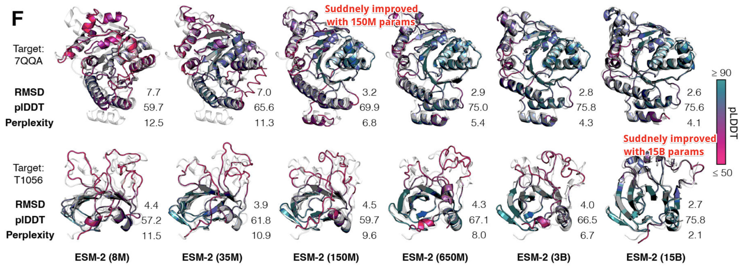 무려 “These modifications lead to a significantly better model” 이라 언급하는데, 이전 버전에 비해 약 1/4 규모의 파라미터로도 더 향상된 성능을 보이는것을 그 근거로 삼고 있다. 이들중 (2), (3) 요소는 기본적으로 NLP task를 해결해 온 접근법인데, 저자는 (1) Perplexity—NLP task의 evaluation metric—가 model-size에 따라 증가하게 되면, TM-score의 격차도 많이 벌어지는 것; (2) Ablation study에서 language model이 가장 높은 기여를 함 을 보임으로써 NLP task에서의 접근법으로 해당 문제를 푸는 것을 정당화 하고 있다.