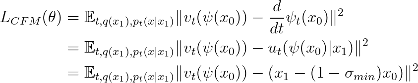 이렇게 구해진 것들을 원래의 conditional flow-matching objective $L_{CFM}(\theta) = \mathbb{E}_{t, q(x_1), p_t(x|x_1)} \| v_t(x) - u_t(x|x_1)\|^2$ 에 넣으면 아래와 같아진다