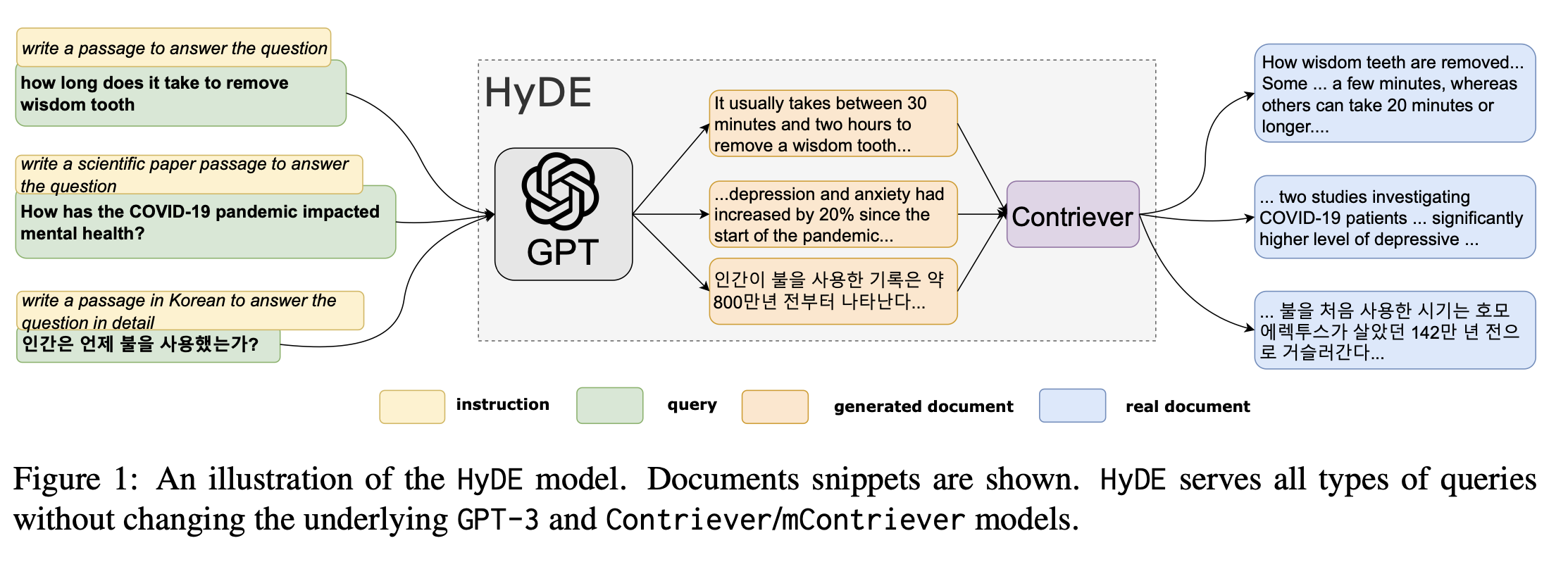 - to improve the accuracy of the document search with the encoded-feature, authors suggest a novel method HyDE : the input of the contriever is not only the query, but also the LLM-generated "possibly fake" answer.